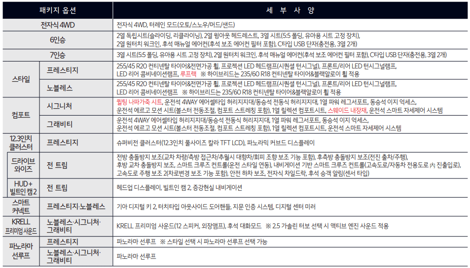 4WD는 선택사양으로 232만원이 추가되며, 패밀리를 위한 6인승과 7인승도 각각 84만원, 69만원에 선택 가능합니다. 스타일이나 컴포트, 드라이브 와이즈 같은 다양한 옵션 패키지도 준비되어 있어 개인의 취향에 맞게 차량을 구성할 수 있습니다.